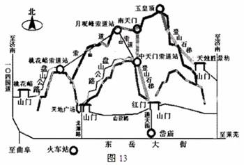 泰山是我国著名的风景名山,号称五岳之首。其旭日东升、晚霞夕照、黄河金带、云海玉盘被誉为四大奇观。图13为泰山旅游线路示意图。