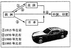当丰田汽车正在向世界第一个年产千万辆汽车企业的目标迈进时,底特律上空正被上亿美元的场子损和裁员的阴云笼罩。读“世界汽车工业的转移”示意图,回答24-26题。