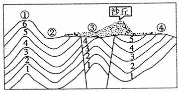 31.读某地地质地形剖面图,图中1、2、3、4、5、6为地层编号,表示地层由老到新。则下列说法中,不正确的是 ( )