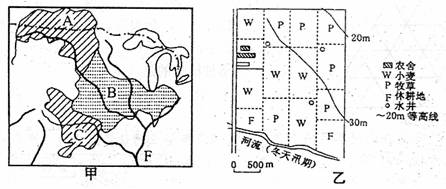 (2)比较甲乙所在区域农业生产地域类型,及各自特点。(7分)