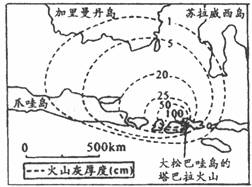 下图表示1815年印度尼西亚大松巴哇岛的塔巴拉火山爆发后火山灰厚度的分布,读图回答5-6题。