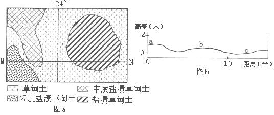 图a为我国局部地区土壤分布图,图b是图a中沿46°纬线上MN两点的地形剖面示意图,据此回答6-8题: