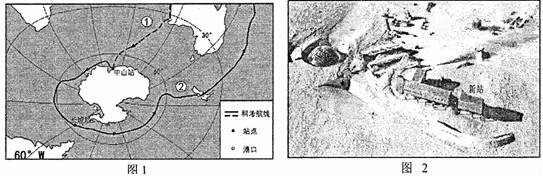 (2)图1中①、②分别示意此次科考的前往与返回航线,请结合图示往返航线概述科考队乘“雪龙号”在往返航程中需要应对与克服的主要困难,并指出由中山站前往长城站航线上最北点的经纬度(地理坐标)。(8分)