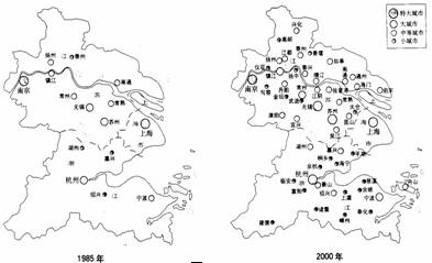 26.(12分)下图是不同时期长江三角洲地区的城市空间分布图,分析回答:
