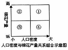 读我国几个省区人口密度与棉花产量关系组合示意图,回答23-24题。