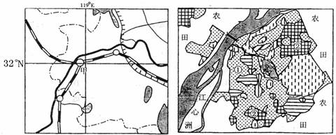 读下面甲城的地理位置(左图)和城市用地结构(右图)图,回答34-36题。