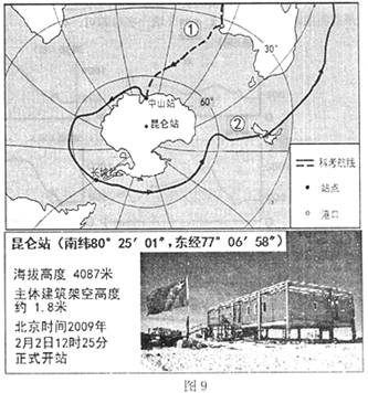 (3)我国已在南极内陆地区建立了考察站--中国南极昆仑站,此站的建立采用的是高脚式建筑。请结合图9和所学知识简要说明昆仑站主体建筑需要一定架空高度的主要原因。(6分)