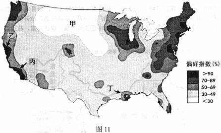 23.(16分)人们在选择工作与居住地时多受就业机会、治安、文化生活和自然环境等因素影响。图11是针对美国大学生的居住与工作地选择情况,抽样调查所绘制的“偏好指数”空间分布图。读图并结合所学知识回答下列问题。