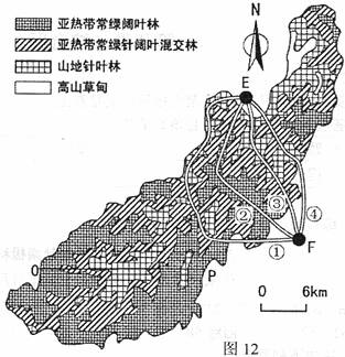 (3)计划在图12中的E、F两地之间修建一条公路,①一④备选方案中哪条线路最合理?试说明其理由。(6分)