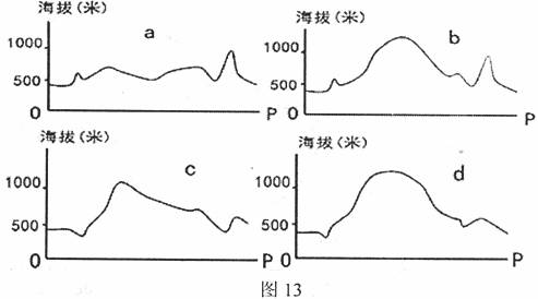 (2)图13中O-P线的实际直线距离约为 千米,下面四幅图中与O-P线地形剖面图基本相符的是 (填一字母即可,4分)