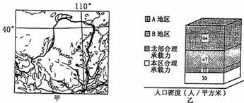 下图中甲为某区域地形图、乙为该区域人口密度和人口合理承载力情况图,读图完成22-24题。