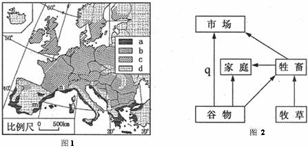 图1为欧洲四种农业地域类型分布图,图2是该区域某种农业地域类型的经营方式示意图。读图回答36-38题。