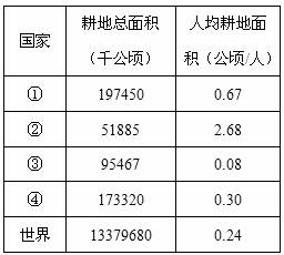 C.③国人口众多,人均耕地面积小 D.③国山区面积广大,耕地比重小