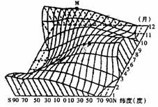 读“一年内太阳辐射的纬度分布示意图”(下图),分析判断5-6题。