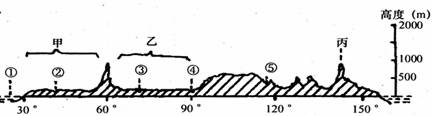 读沿某纬度所作的海陆剖面示意图,当北半球夏到日,甲地的正午太阳高度角为43°08′,判断19~21题。