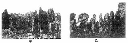 图中,甲、乙两处不同的峰林景观所在地是我国著名旅游胜地。读图回答18-19题。