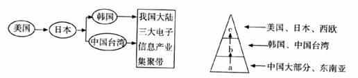 读我国承接全球IT产业转移的路径图(左图)和IT全球化竞争的金字塔模型示意图(右图,回答38-40题.