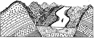 C.岩层断裂下陷,河流携带泥沙沉积形成的