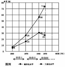 读下面某国工业化、城市化进程比较图,回答16-17题。