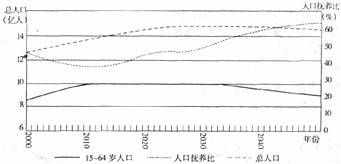 读我国总人口、劳动年龄人口及人口抚养比(每100名劳动年龄人口负担的非劳动年龄人口数)变化图,完成14-15题。
