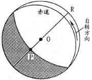 下图是以O点为中心的俯视图,阴影部分为夜,空白部分为昼;O点的纬度刚好出现极昼现象,且正午太阳高度角为40°。回答3-4题。
