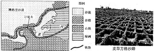 包兰铁路自包头至兰州,全长990公里,全线有140公里在沙漠中穿行。其中在中卫和干塘间经过腾格里沙漠(如下图所示)。所采取的防沙、治沙措施,曾获1987年国家科学技术进步特等奖。回答5-7题。