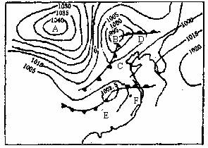 (2)C、D、E、F四地中,即将发生明显天气变化的是_ _____,原因是该地受到__ ___的影响,届时将出现___ ___ _天气,当此天气系统过境后,天气变化是___ ___。