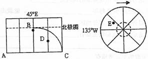 (四)在左图中,AC为赤道,BC为晨昏线的一部分,B点的地方时比A点的早,此时D点的地方时为15时。据此,回答下列问题。(10分)
