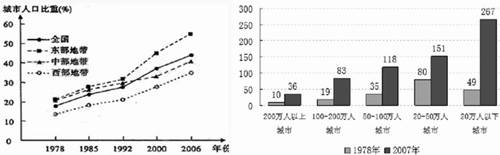 (六)提高城镇化水平,是优化城乡经济结构、推进产业结构调整的重要因素。读下图“两类不同国家城市化发展情况统计图”,以及“我国城市人口比重图”、“我国1978年与2007年城市数目比较图”,回答下列问题:(12分)