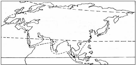 (七)12月初,一艘货轮从世界第一大港启航,沿途停靠埃及亚历山大港、印度孟买港和新加坡港,冬至日时到达上海。读该货轮航线图,回答:(12分)