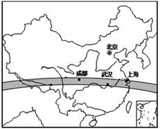 2009年7月22日上午9时左右(北京时间),千年一遇的日全食自西向东扫过我国长江流域(如下图阴影所示)。读图完成1-2题。