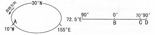 36.(24)下图为“30°N纬线圈和72.5°E经线”,其中30°N纬线上由10°W向西到155°E为夜半球,同时72.5°E经线上只有CD段处于夜半球。读图回答下列问题。
