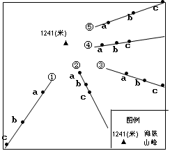 下图中, ①、②、③、④、⑤表示某区域地形类型中的山脊和山谷,点a、b、c对应的海拔分别为900米、600米、300米。读图完成11-12题。