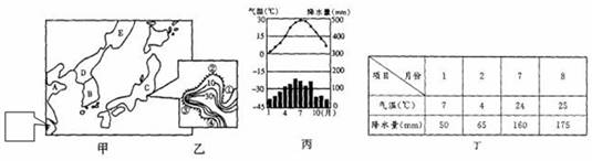 (3)图甲中A、B、C、D、E、F各地,与丙、丁图表资料示意的气候类型及气候特点较吻合的有 ____________ 。