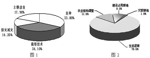 读“1978年-1996年我国农业科技构成对粮食增产的贡献率图”(图1)和“2003年我国耕地减少的因素构成图”(图2),完成25-26题。