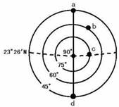 下图为某地区太阳高度的等值线图,ad为经线。据此回答7-9题:
