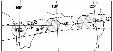 2009年7月22日我国将出现罕见的日全食天象,日、月、地三者位于同一直线,月影刚好投影在地球表面,并且自西向东扫过我国的长江流域,形成日全食观察带(如下图)。届时位于月影区的人们能够观测到日全食。读图回答1-2题