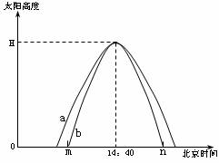 3.若m为北京时间8:40,且a、b两条曲线分别为Q、P两地某日太阳高度日变化情况。则