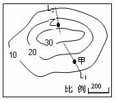 下图为杭州(30°N)某地某座山峰的等高线示意图(单位:米),甲乙为两处风景点,沿虚线L1坡度为30°,沿虚线L2坡度为45°。读图回答6-8题