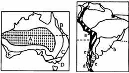 (2)澳大利亚东岸B、C、D三地气候与南美洲西岸a、c、d三地气候的排列都是南北更替、南北延伸,形成这种状况的相同因素主要有 (2分),不同因素主要有 。(2分)