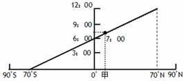 下图为某日120°经线上日出时刻随纬度的变化示意图,读图回答1-2题。