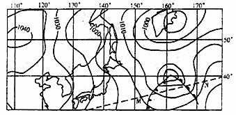 8、如果图中等压线状况维持不变,某海轮从M点向N点航行,下列关于天气变化的说法正确的是 ( )