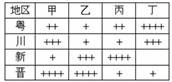 下表表示寒潮、酸雨、水土流失、土地荒漠化对四省区的危害程度,“+”号越多代表危害程度越高。据此完成36-37题。