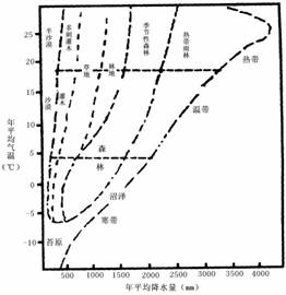 (1)从图中可以看到,森林分布的极端界限条件大约是气温__ ___℃以上,降水 ㎜以上。(2分)