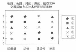 读下图,纵坐标1-5代表各种运输方式的运载量、运价、灵活性、速度四项指标由优到劣的变化,回答8-9题:
