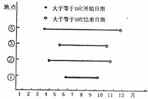 读下面我国人陆东部季风区四地口平均气温≥10℃的开始日期与结束日期示意图,回答23-24题。