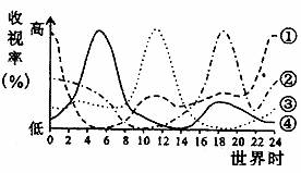 一般情况下,右图中表示北京地区电视收视率变化的曲线是(世界时指的是中时区的区时)
