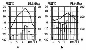 下图中的a、b两图为两地气温与降水量资料.读图回答13-14题