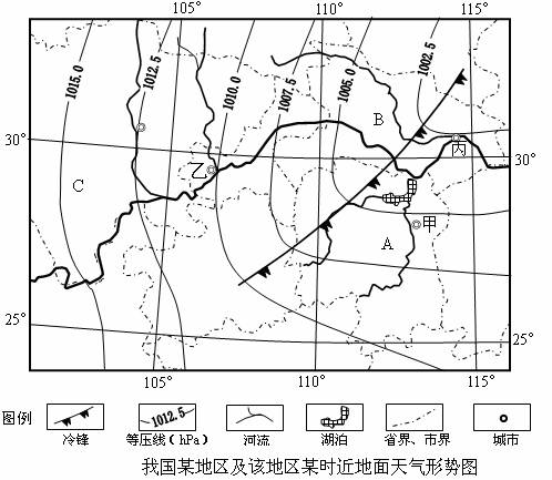 (1)判断此时图中甲城市的风向,并指出锋面系统过境后该地的大气状况(气温、气压、天气)的变化。(5分)