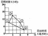 下图是不同地点6月22日的日出时刻与日照时数之间的关系。读下图回答13-15题。